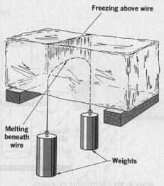 A curva de fusão da água permite-nos uma rápida explicação: mantida constante a temperatura do bloco, um aumento na pressão sobre o gelo em contato com o fio faz com que este se funda. O fio pode então descer um pouco. Cessada a pressão adicional sobre a água esta volta a solidificar-se, unindo novamente as duas partes do bloco. Isso acontece sucessivamente até que o fio atravesse totalmente o bloco, sem dividi-lo.